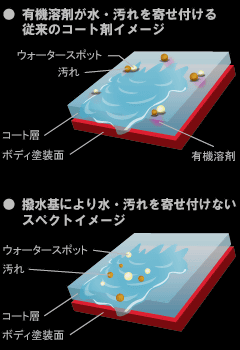 SPECTO処理後のお手入れは、専用のシャンプーによる洗車と付属の撥水ソリューションの使用で長期間大切なお車のボディの艶と撥水性能を持続させます。 |